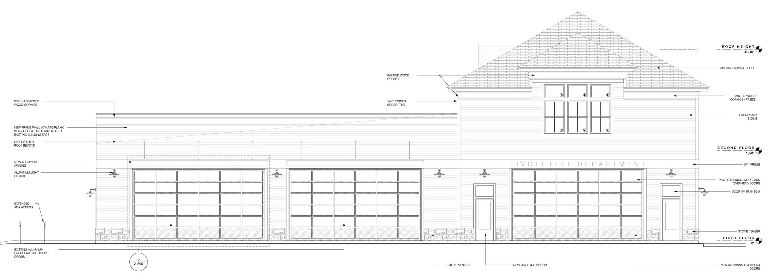 The Firehouse expansion has been designed by the esteemed local architectural firm PSA Studios. It thoughtfully conforms to the architectural character of Tivoli’s Historic District. The design expands the existing building to the west, adding two more engine bays and a second story.